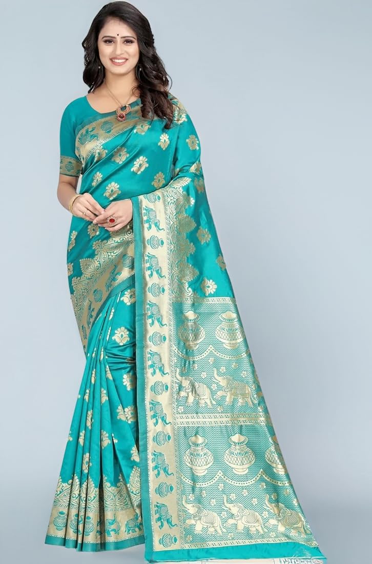 Woven with intricate zari designs, this saree is a timeless addition to your ethnic wardrobe. Available in multiple rich colors.