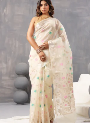 This silk saree features rich zari weaving perfect for weddings.