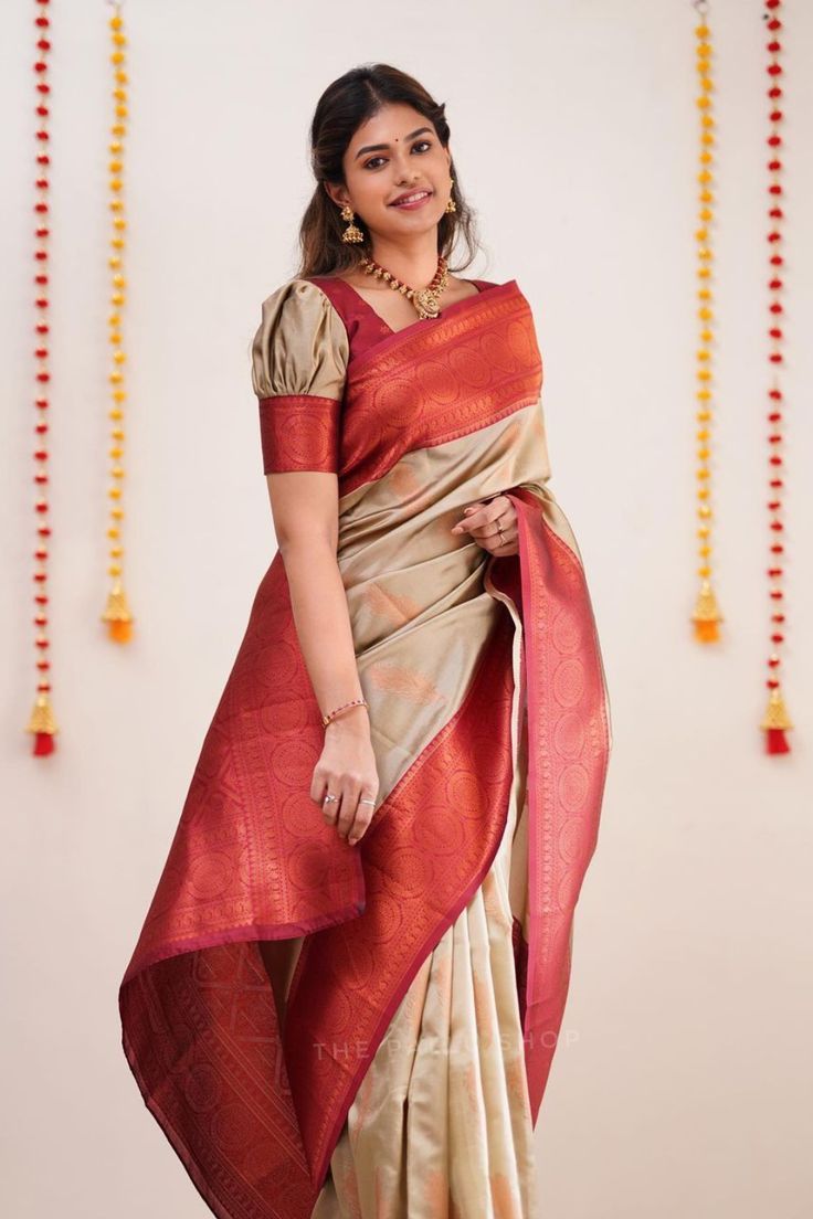 Crafted from premium silk, this saree is adorned with a rich zari border and intricate patterns, ideal for weddings and festive celebrations.