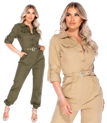 Chic belted jumpsuit with utility pockets and ankle cuffs.